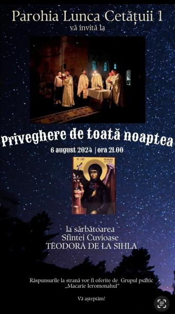 Marți, 6 august, începând cu orele 21, se va săvârși priveghere de toată noaptea în cinstea Sfintei Cuvioase Teodora de la Sihla, a cărei pomenire se face în fiecare an la 7 august.
